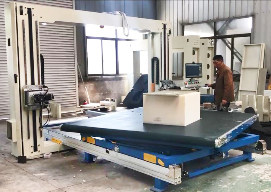 机型特点:自动化程度高,双面切割,自动复位,加工精度高; 90度自动旋转式工作平台,可切割金字塔形状、波浪形状、带弧度等规则不规则形状。边角料少,耗材成本低,噪音低,无粉尘。 应用领域:功能床垫,室内装饰,汽车用品等。